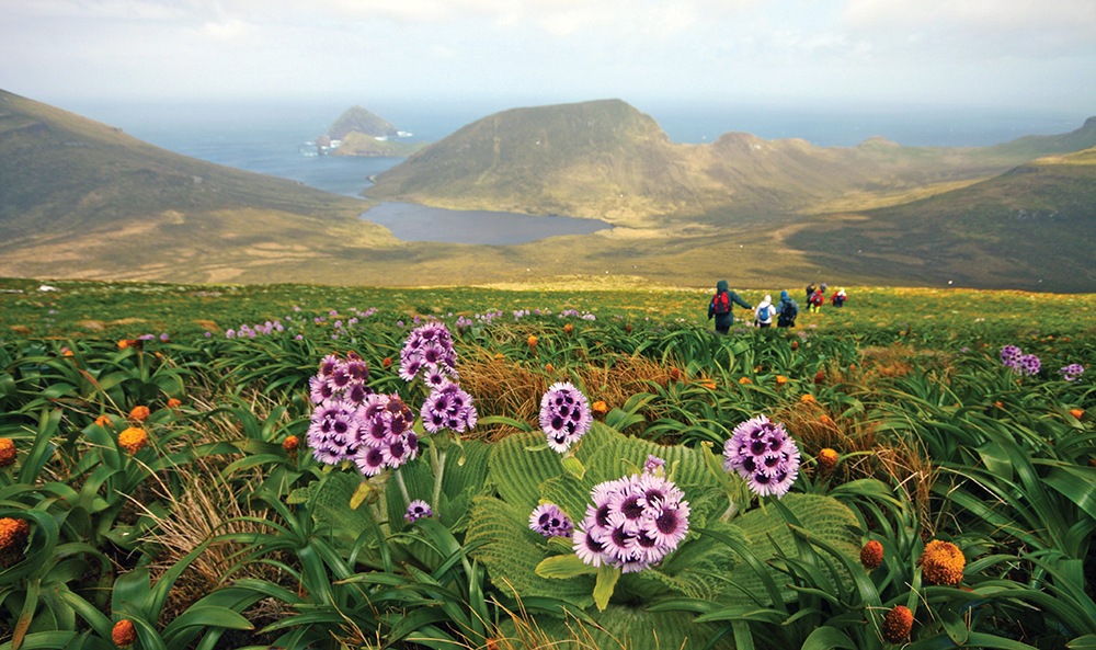 It feels like we’ve stepped onto the set of a 70s sci-fi movie as we pass the nodding golden cylinders of Bulbinella rossii and dusty pink cauliflowered spheres of Anisotome as waves crash on rocks far below. The first stop on Christchurch-based family-owned and -operated pioneering expedition cruise company Heritage Expeditions Subantarctic Galapagos of the Southern Ocean voyage, Campbell Island is now a conservation cornerstone of New Zealand’s Subantarctic Islands.