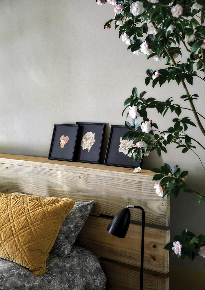 In the suite above, a simple boxed wooden headboard made from recycled planks and topped by a trio of small artworks sets off yellow quilted pillows and a bedspread beautifully. A tall Camellia sasanqua plant provides a romantic botanical touch.