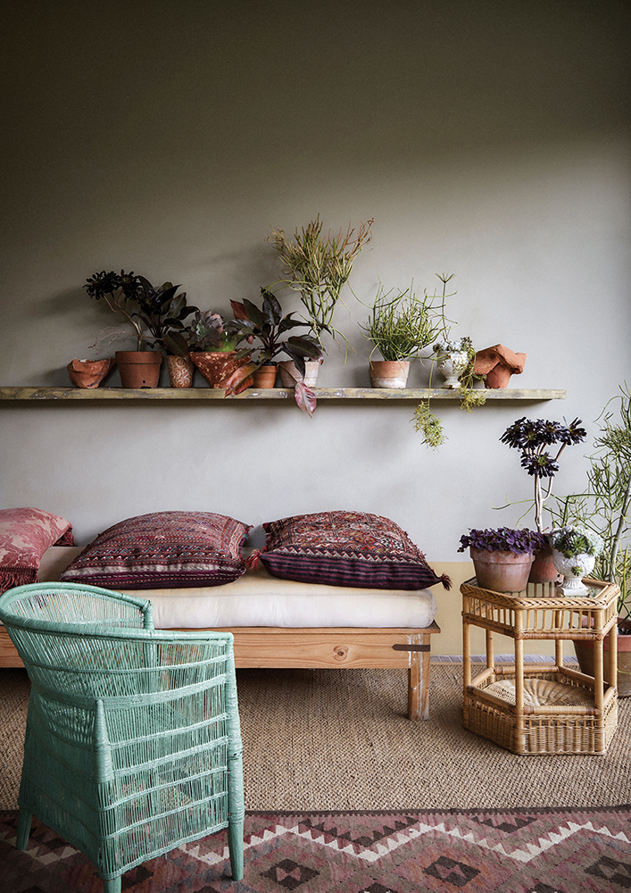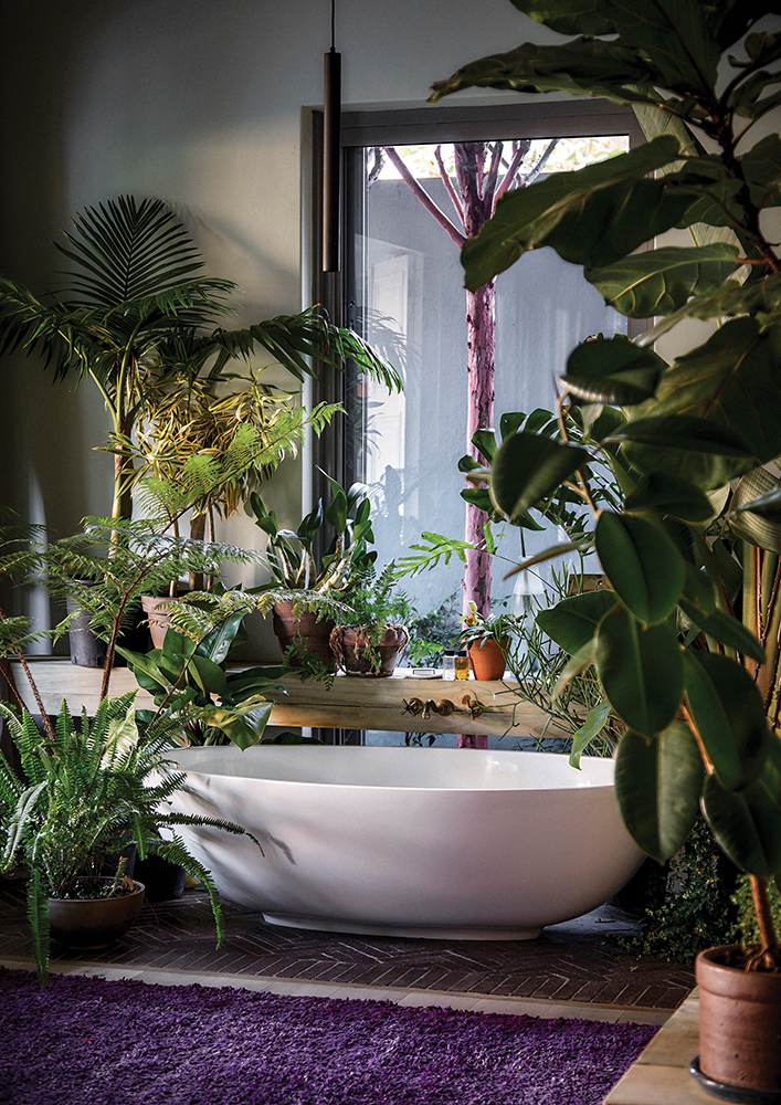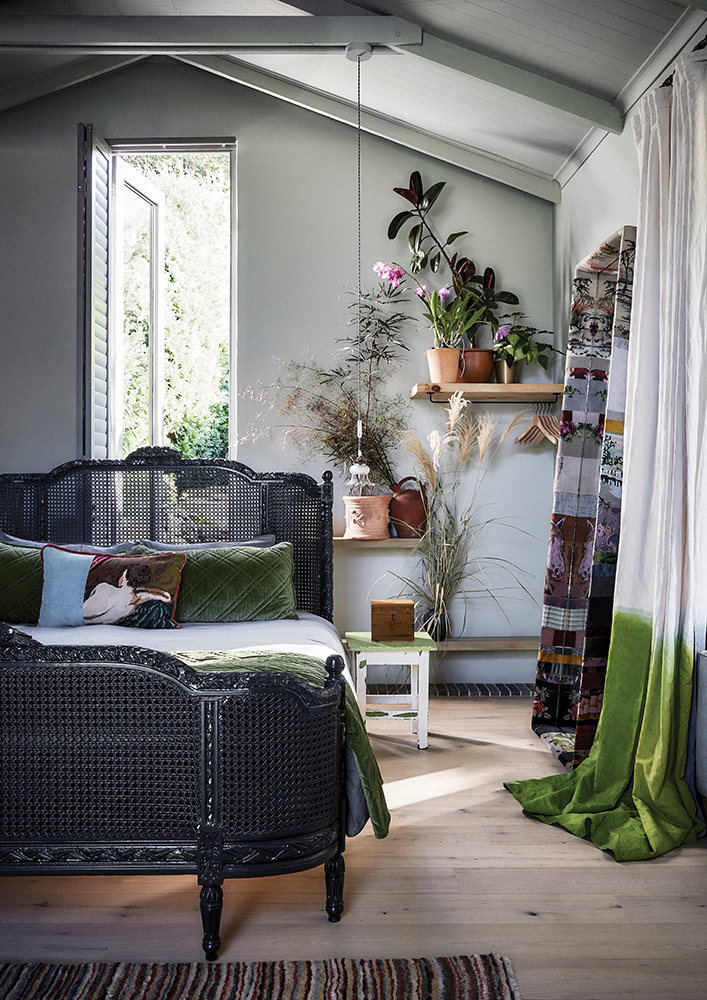 Plants are present everywhere at Johannesdal 1207. In another suite (right) in the boutique accommodation section of the development, a vintage rattan bed is surrounded by the greenery provided by a selection of plants in classic terracotta pots. The plants include an aralia, a Ficus robusta and cattleya orchids; Dané is currently much interested in the aesthetic created by combining these – or other more lush and broad-leaved species.
