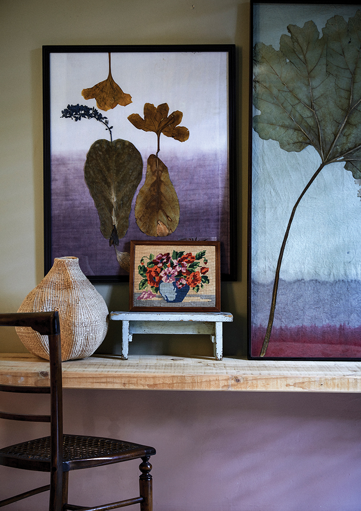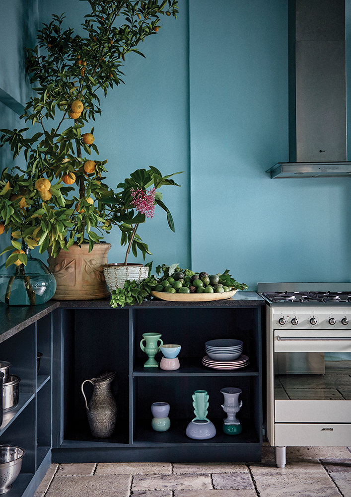 In the kitchen of one of the accommodation suites (left) branches from a Cape rough skinned lemon pop against a teal wall and a large dish holds freshly harvested granadillas. The pastel-coloured milk glass plates, vases and jugs on the shelves were all found at Cape Town’s Milnerton Flea Market.