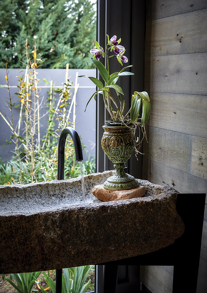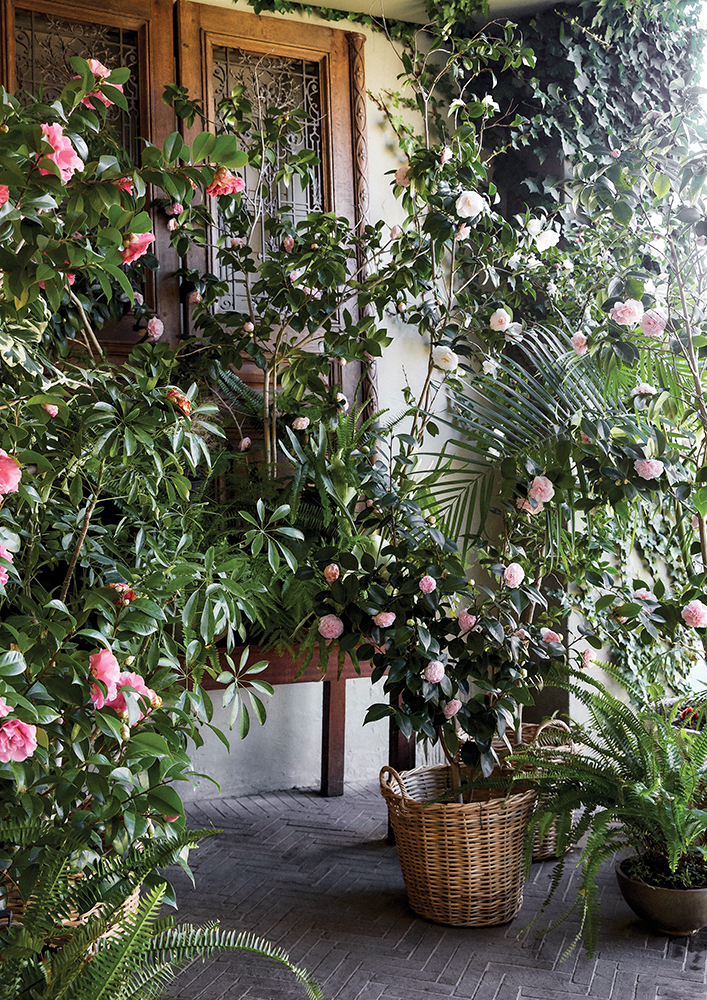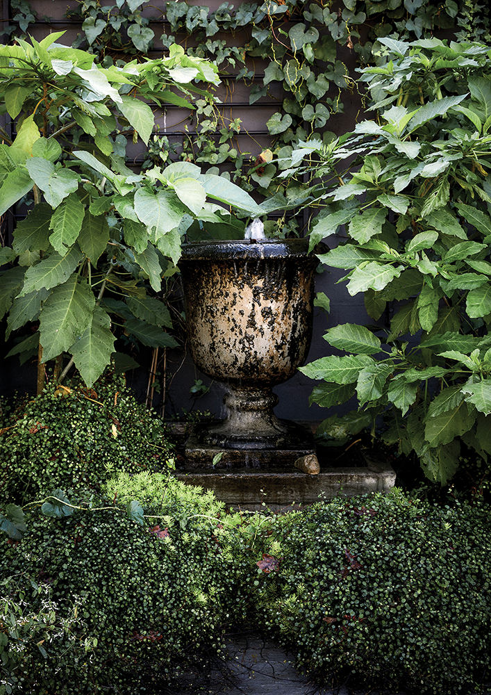 A shaded corner of the garden (right) at Johannesdal 1207 includes a water feature made using an old urn, flanked by moonflower creepers and with an abundant creeping wire vine planted at its base. The latter is a twining and low-growing plant with delicate foliage that hails from Australia and New Zealand and makes an excellent, mat-forming ground cover in shady areas. It can also be grown as a container plant, both indoors and out.