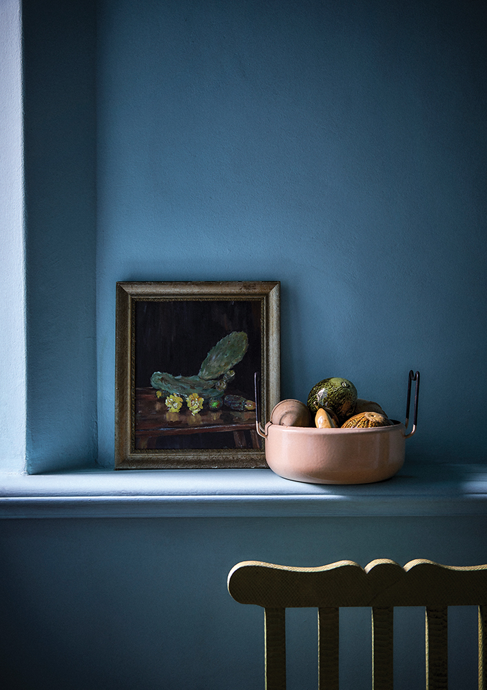 Every corner has been carefully considered at Johannesdal 1207. Above, a recessed shelf painted in tranquil blue showcases a small, unsigned still life, as well as a bowl filled with glazed ceramic fruits and seed pods.