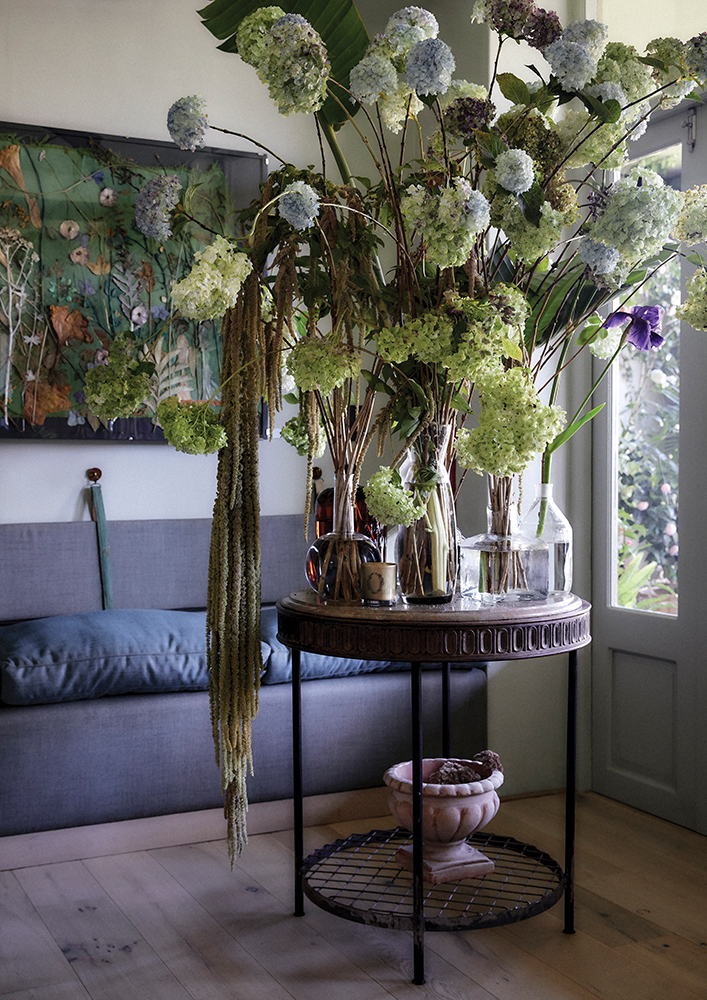Above, a spectacular arrangement of winter-flowering camellias in baskets intermixed with potted ferns, created by Dané, are at one end of the intimate Die Stoep (The Veranda) venue at Johannesdal 1207. Pictured right, this dramatic arrangement by Dané, featuring hydrangeas and trailing Amaranthus caudatus in multiple glass vessels and vases, is placed on a vintage table in Die Stoepkamer (The Reading Room) at Johannesdal 1207.