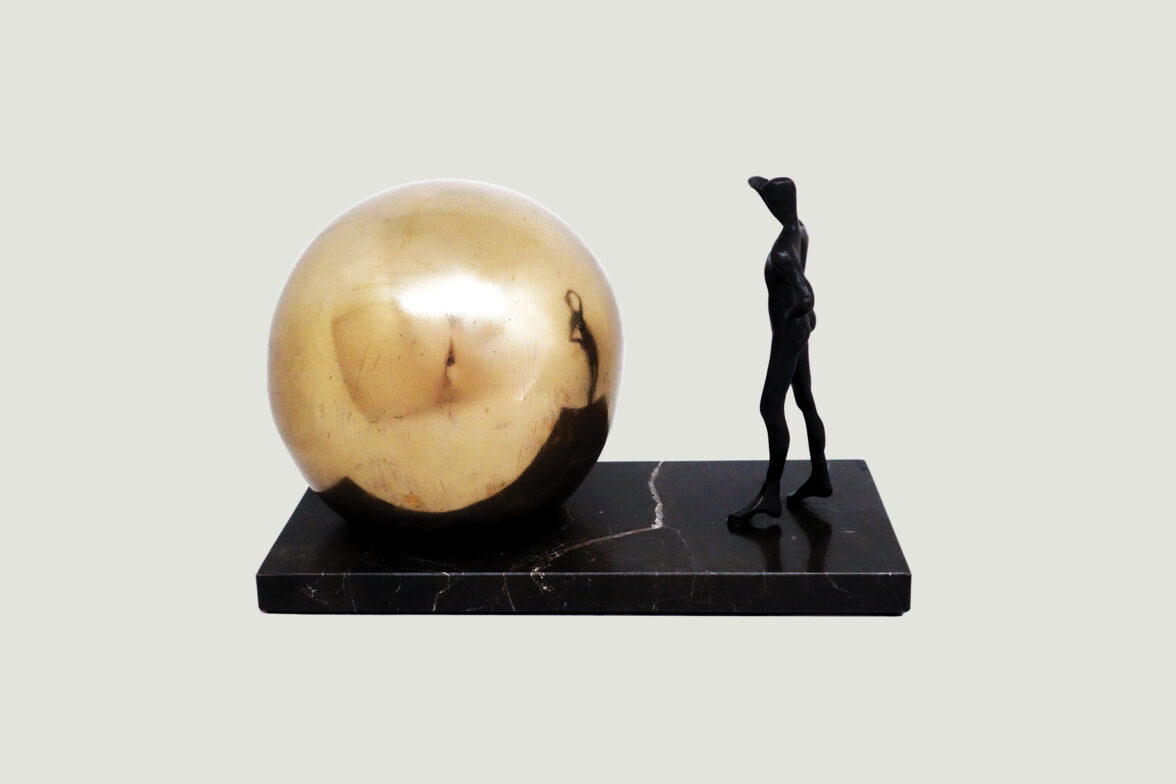 In A Moment of Reflection, a bronze figure looks into a golden reflective space, viewing and being present in ‘the now’, while the future is unwritten. The viewer too is able to glance into this space and find their present moment reflected back, a reminder that we are here in ‘the now’.