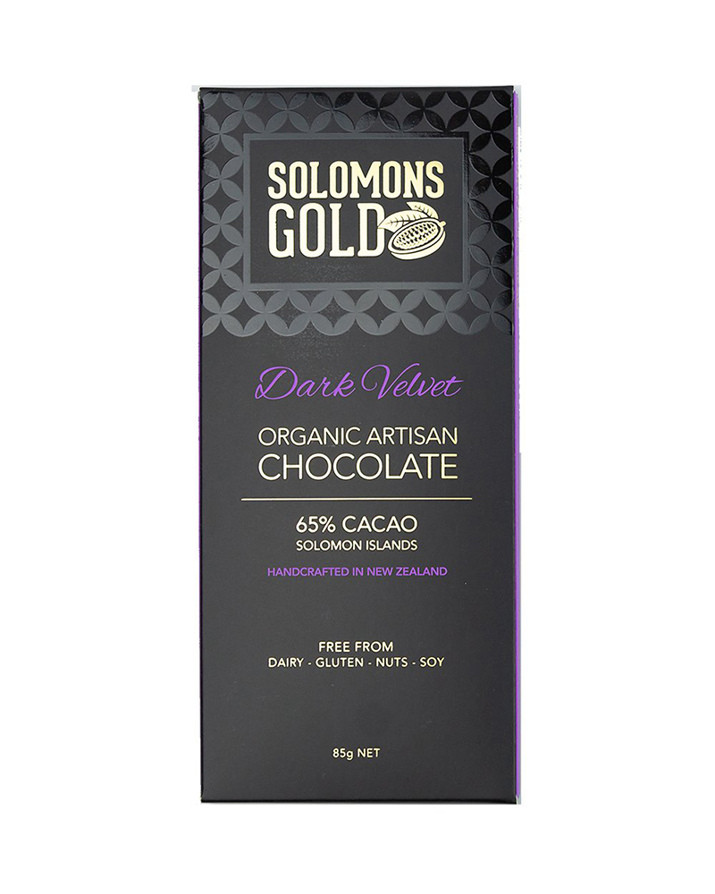Single origin cacao grown in the Solomon Islands is combined with virgin coconut oil to create dark velvety chocolate.