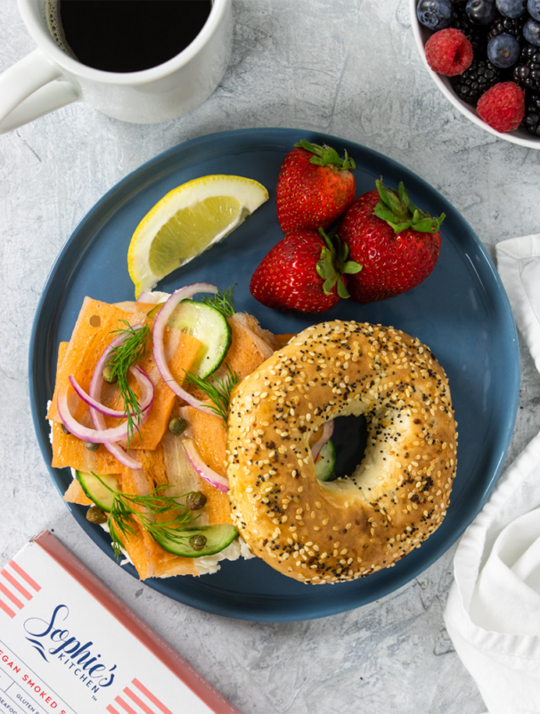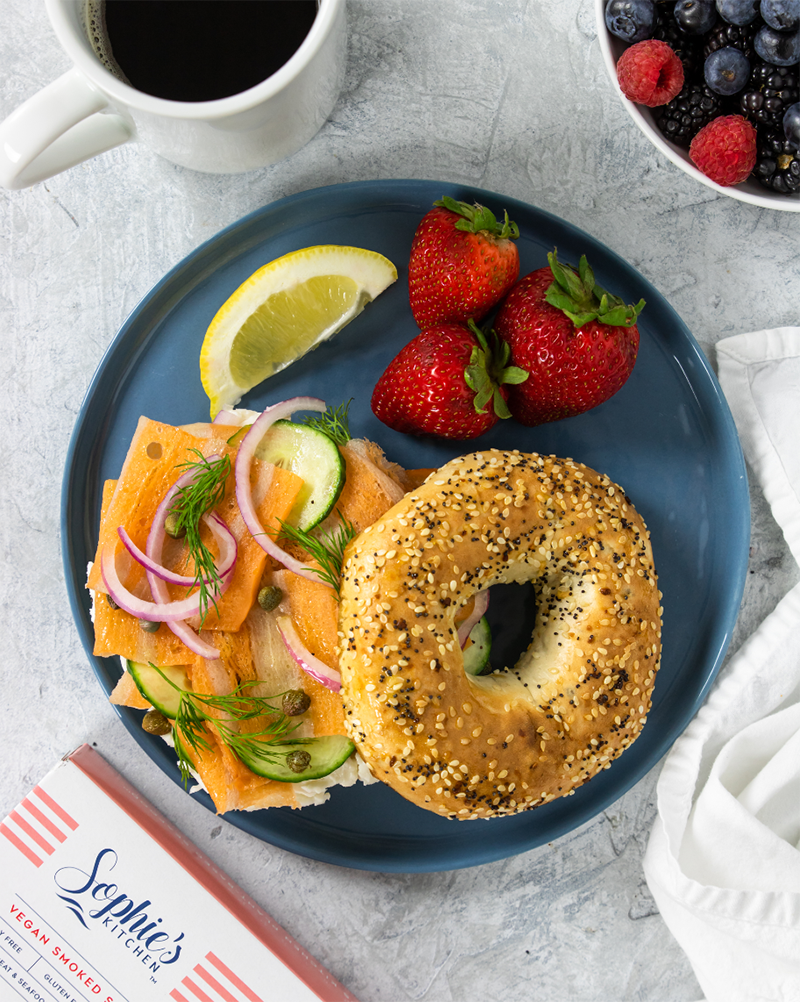 Start the day with breakfast bagels everyone can enjoy with Sophie’s Kitchen Vegan Smoked Salmon.