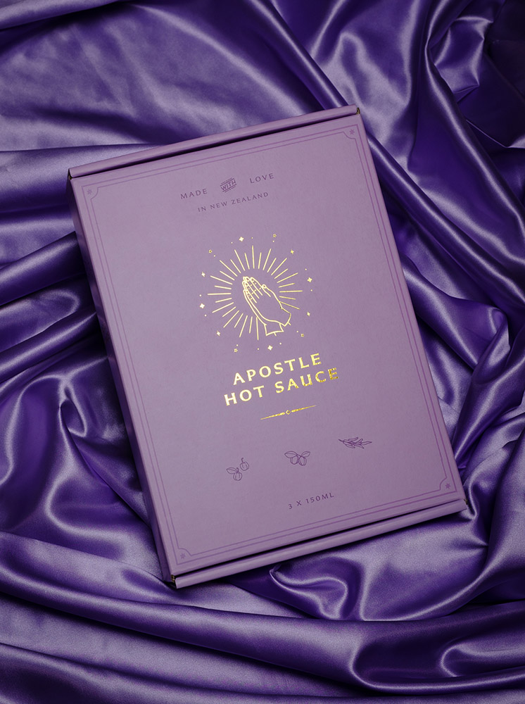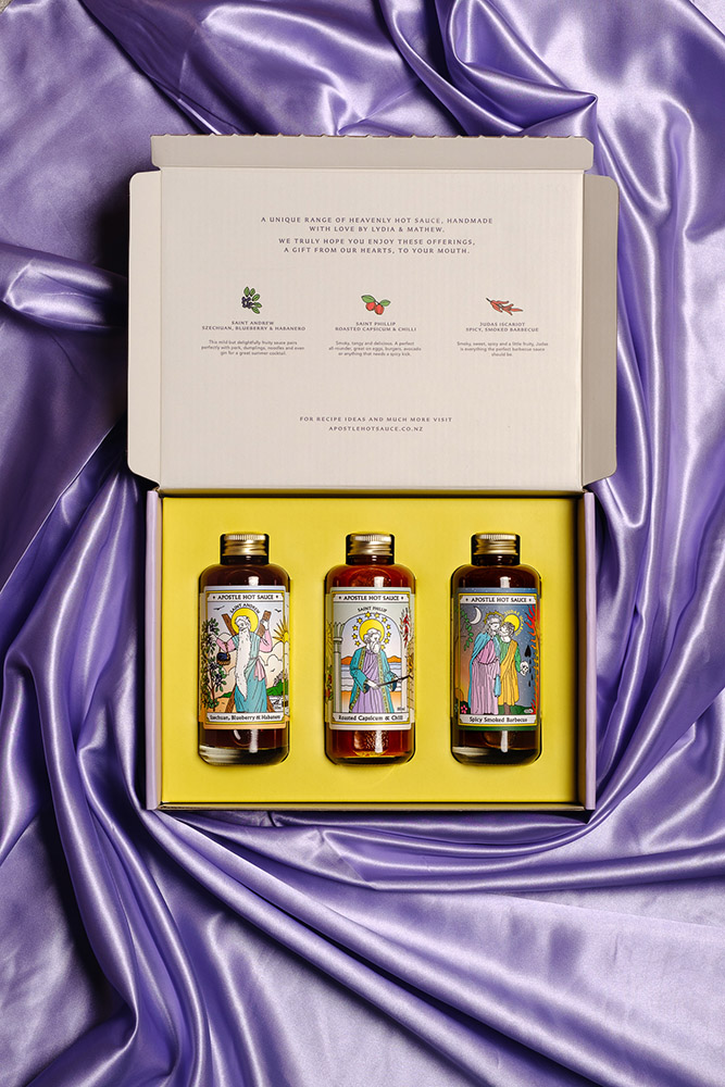 Pictured above – The humble sauces are Saint Phillip – roasted capsicum and chilli, Saint Peter – kiwifruit and kawakawa verde, Saint Matthew – chocolate and manuka smoked chipotle, Saint John – mango, turmeric and ginger, Saint Andrew – szechuan, blueberry and habanero and Judas Iscariot – spicy smoked barbecue. Photo — Alexanders Art Agency
