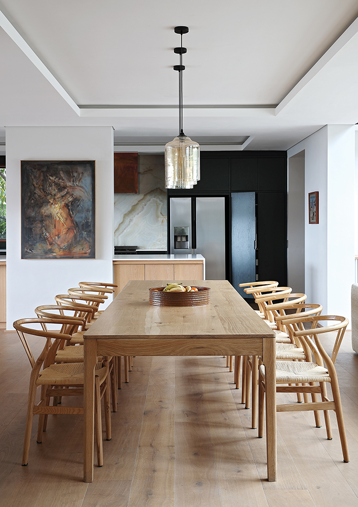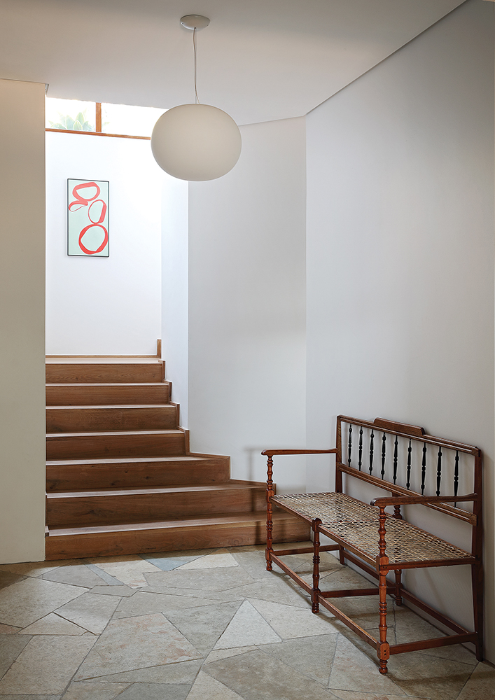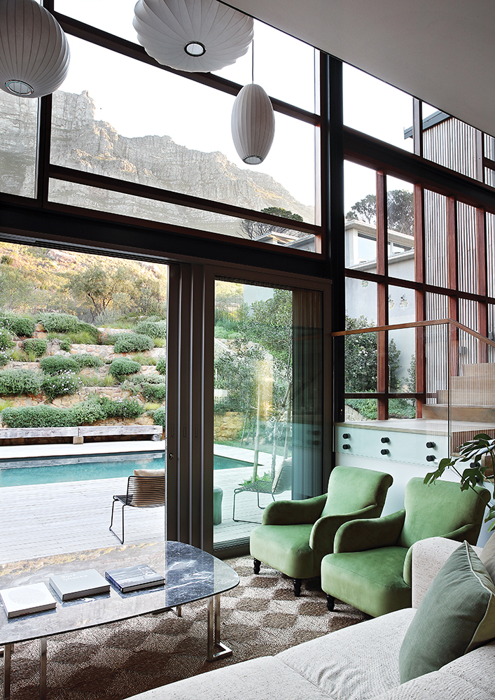 In the living room on the southern side of the house, a beautiful double-volume space with huge floor-to-ceiling windows lets in views of Table Mountain as it cascades right down to the house. “We have a lot of glazing and no eaves,” says Candace, so the views are vast and unobstructed. The light on this side of the house is soft and indirect, so it doesn’t get too hot. The stairway with its glazed façade on the southern side of the house, lets in views of the mountain and lovely soft natural light.