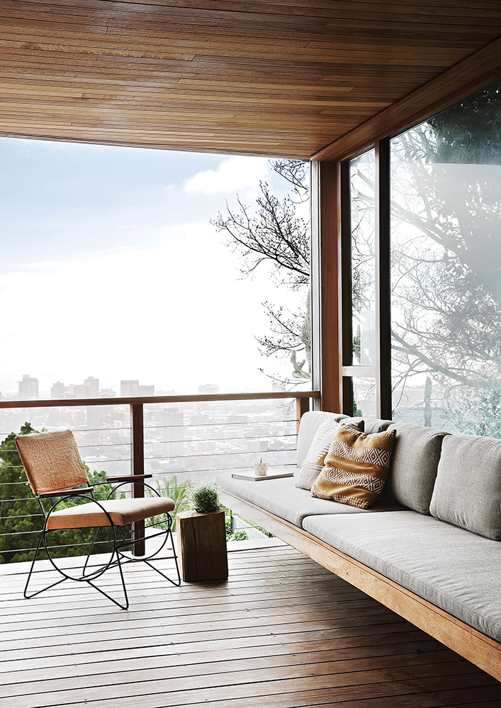 Homeowners Candace and William Marshall-Smith worked with architects Stuart and Matt of STARC to convert the existing 1970s house on the property into a mid-century influenced home. They ingeniously wrapped the front of the house, which faces north, with balconies, which not only make the most of the beautiful views (lifting the low eaves which used to block out sections of the vista), but also emphasise the horizontal lines of the architecture, so that the double-storey house is less imposing. Slatted timber screens provide protection from the elements and the screens help keep the interiors cool.