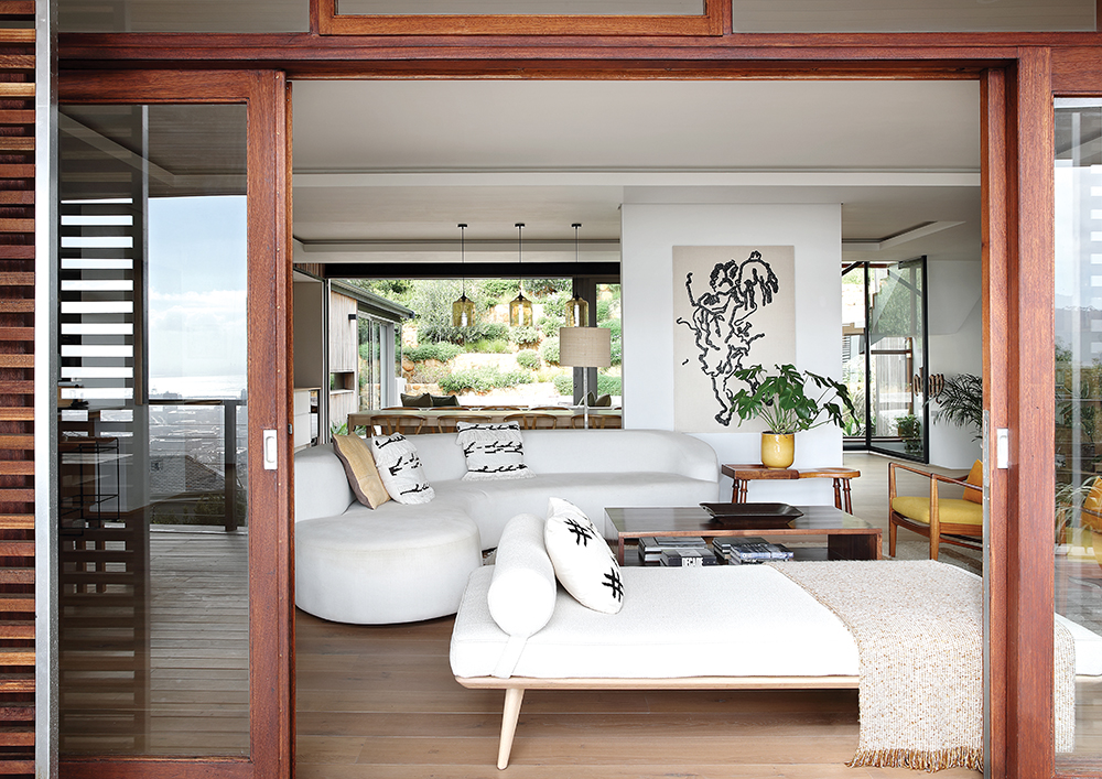 The front lounge opens onto the deck, which takes in spectacular views of the city and the harbour beyond. This open-plan arrangement is furnished predominantly with mid-century pieces, in among an eclectic collection of sleek, clean-lined contemporary pieces. “Christine found these beautiful chairs on auction,” says Candace, referring to the restored Danish modernist armchairs. “We had them recovered.” The curved sofa and daybed were designed and produced by interior designer Christine Joubert.