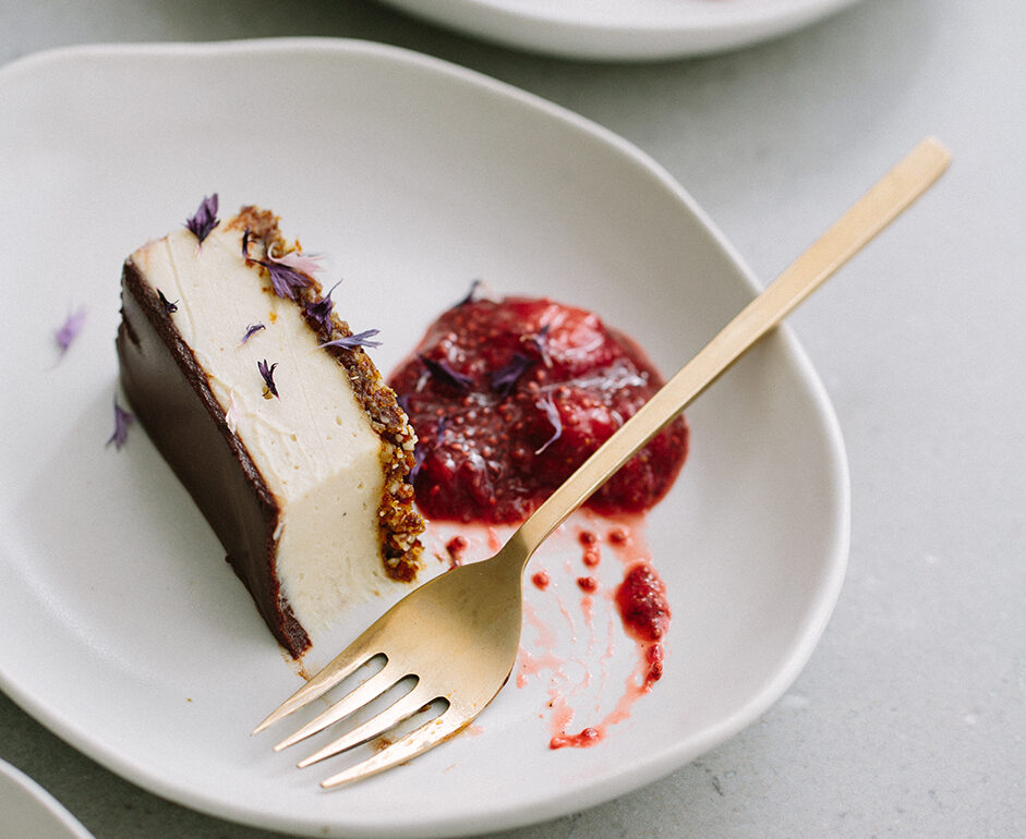 To make the filling, place all the filling ingredients into a highpowered blender and blend on high until smooth. If you don’t have a high-powered blender, finely grind the cardamom seeds in a mortar and pestle first, before adding to the blender. Pour the mixture over the base and smooth the top. Allow to set in the fridge for at least 6 hours or preferably overnight.