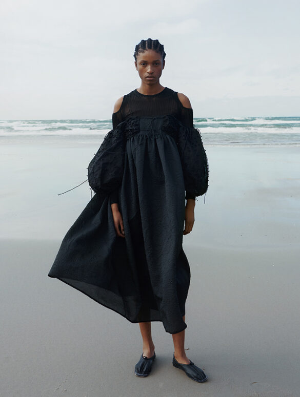 For Bahnsen, contradiction is forever playful and unaggressive. Simple A-line dresses are enhanced by voluminous puff sleeves and tiered, panelled skirts, while sculptural silhouettes are rendered in ethereal silks. Even within a collection, Bahnsen is unafraid to experiment and unwilling to be pigeonholed, equally adept at producing luxurious, futuristic knitwear as she is at adding a romantic touch to your everyday midi dress. There are certain signatures that act as a throughline in her work: scalloped ruffles and cutouts adorn seams and hemlines, shoelace ties that wrap around waists, sleeves and backs, but they do not serve as simple embellishments, rather as a counterpoint to the clothes they inhabit.