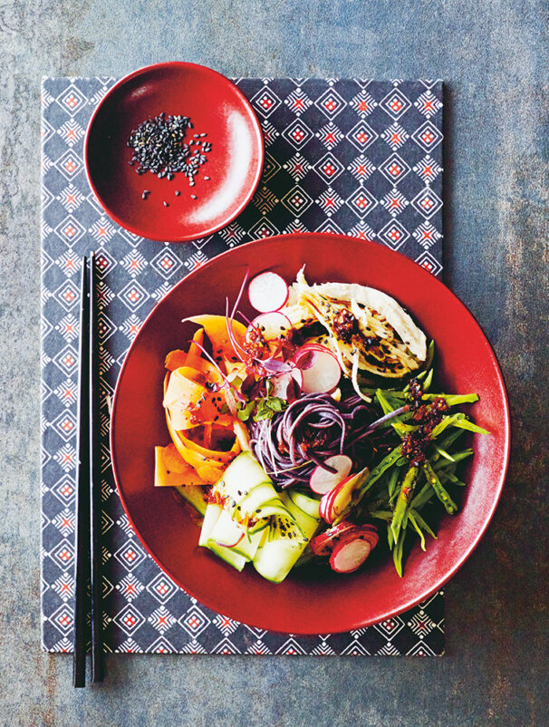 This summer salad can be made using any Japanese noodles. These black rice noodles make a startling contrast to the different vegetables and micro herbs when arranged on the plate giving a striking result.