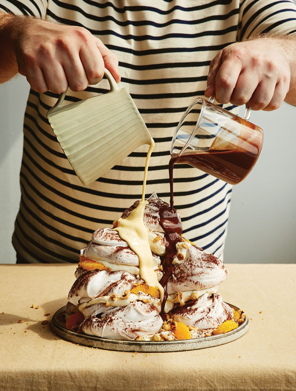 to encase the sauces), using the whipped cream as an edible glue. Top the first layer of meringues with another three, then two, then one, to create a tower of meringues. randomly place the orange segments around the tumble. - At the table, pour over the two sauces, scatter over the hazelnuts and enjoy! 8. Once assembled the dessert should be served immediately.