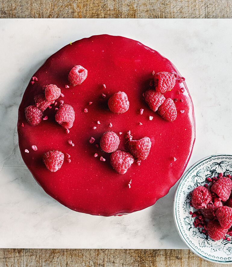 Pass the glaze through a fine-mesh strainer then leave to cool to 32°C. Remove the cake from the pan, place it on an upturned plate or bowl that is slightly smaller than the cake and then onto a cooling rack. Completely cover the cake with the glaze and leave to set. Transfer to a serving plate and refrigerate until ready to serve. Decorate with both fresh and freeze-dried raspberries just before serving.