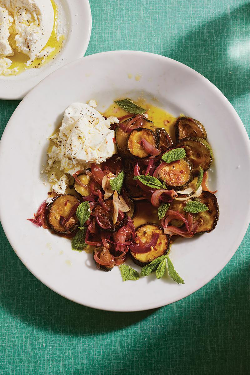 Sprinkle over 1 peeled and thinly sliced clove of garlic and a few more dried chilli flakes, tear over the leaves from half a bunch of mint and drizzle with a little olive oil. Season 250g of ricotta with salt and pepper and spoon it next to the courgettes.