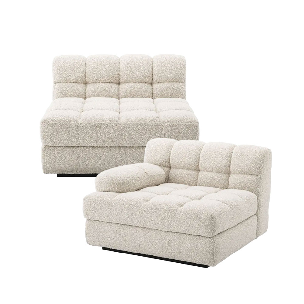 Play around to your heart’s content with the different seat modules of the fabulous Dean series. Upholstered in bouclé cream and mounted on a black base.