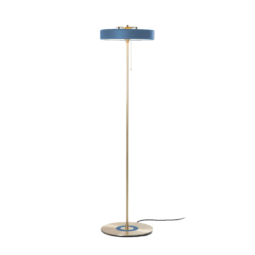 Overhanging matte-lacquered spun metal shade with hand-brushed brass stand, solid brass base featuring matching colour-coded detail and a Brass pull-chain switch.