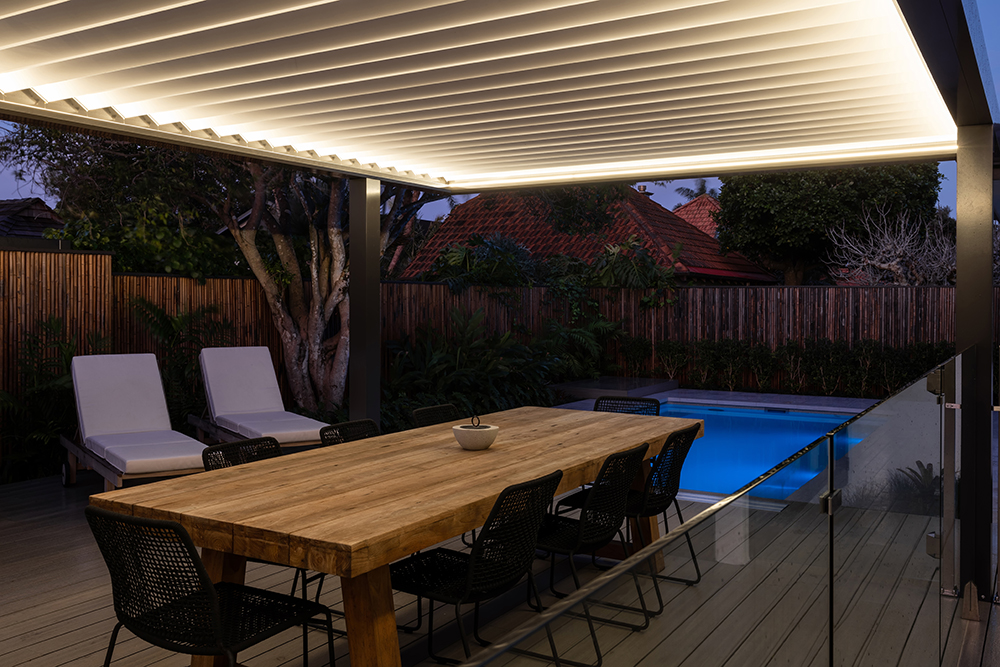 Experience the ultimate all-weather outdoor living space with an EXO® Louvre Roof System.