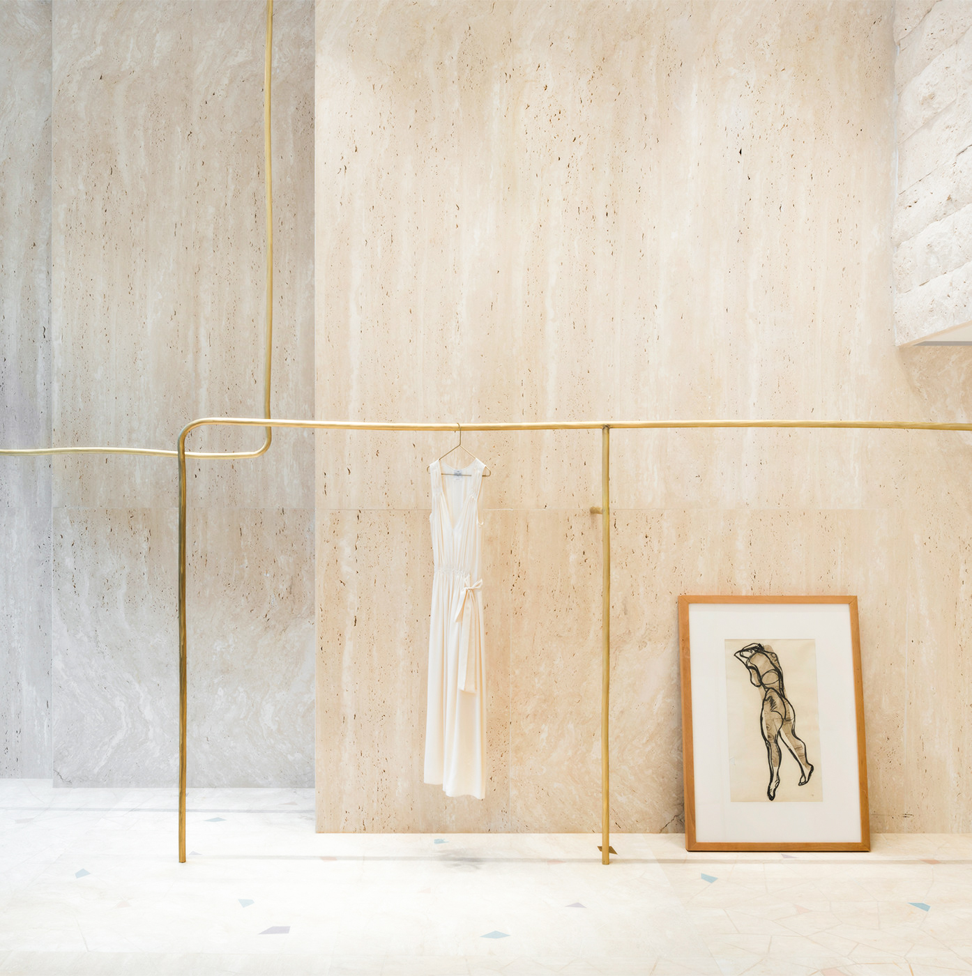 For contrast, they’ve used other natural materials to create and incorporate a complementary yet standout style for the interior. Stunning marbled onyx floor, doors and panels adorn most of the boutique. White, clean lighting highlights the hues found in the ancient gemstone. Fitting rooms are padded in a plush, pale green velvet and there are large green plants around, to bring a fresh living element. Lengthy clothing racks are brass, as are the shelves and hangars. Some brass uniform panels accentuate the golden hue streaks found in the onyx.