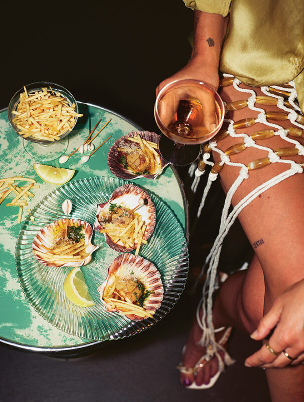 Top the scallops with French Fries and parmesan. Serve with lemon wedges. Skewer or fork them. Extra French fries on the side.