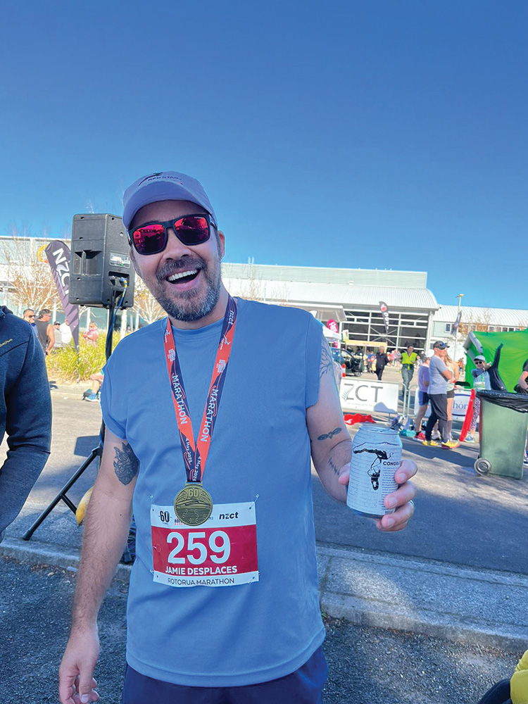As the kilometres increased, I entered quarter- and halfmarathons and then came training for Rotorua. Running seemed to occupy my every waking thought. I would regularly run half-marathon distances multiple times a week. Sometimes I’d run twice a day. Big runs. Night runs were my favourite, tearing through the still, salty air along Tamaki Drive. Once in that galloping groove, it feels as though your heart, your breath, your thoughts, and your feet all move to the same beat. The rhythmic rubber thudding against the pavement sends you into an almost hypnotic state. It’s meditation, on the move. And runner’s high really is a thing.