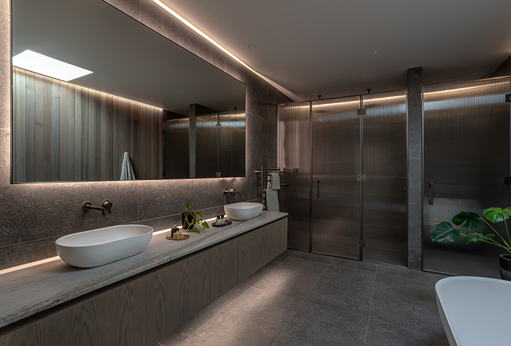 A rich interior palette elevates the home to another level of luxury: stone tiled bathrooms with fluted glazed shower screens, American oak flooring, Negresco quartzite benchtops, and a floating timber staircase all pair beautifully with the concealed lighting which gives a warm, relaxed feel as the sun sets. Externally, long-lasting finishes have been used to give the home a sense of permanence and longevity. Board-finished concrete panels frame the entrance space and street front, with panels of cedar to soften, whilst the floating upper floor is accentuated with white plaster.