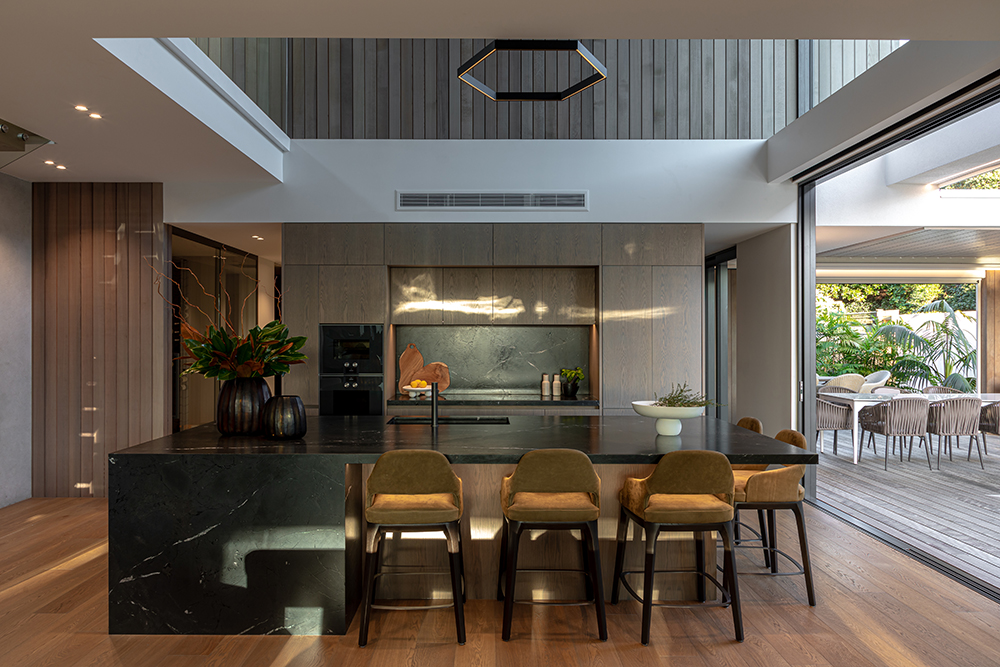 Functionally, the home is subtly split into public and private spaces. A glazed void defines the double-height entrance and circulation spaces, whilst connecting the expansive lounge-kitchen-dining space to the upper-floor bedrooms, which have been separated into adult and teenager spaces by the double-height space over the kitchen.