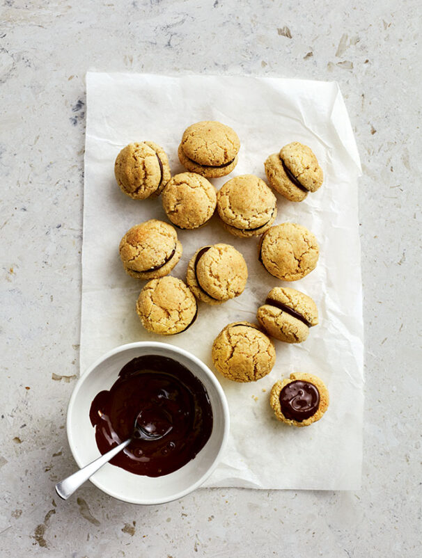 Spoon about 1/2 teaspoon of the melted chocolate on the flat bottom of half the cookies and sandwich them with the other half. Return the cookie sandwiches to the baking sheets and let stand until the chocolate sets before serving.
