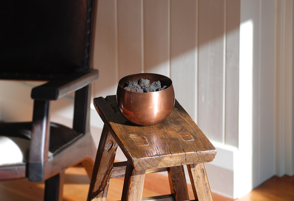 The fragrances of HOHM (the name is a clever combination of home and ohm) feature pre-doused, long-lasting scented lava stones in a gorgeous copper vessel which resembles a Tibetan singing bowl.