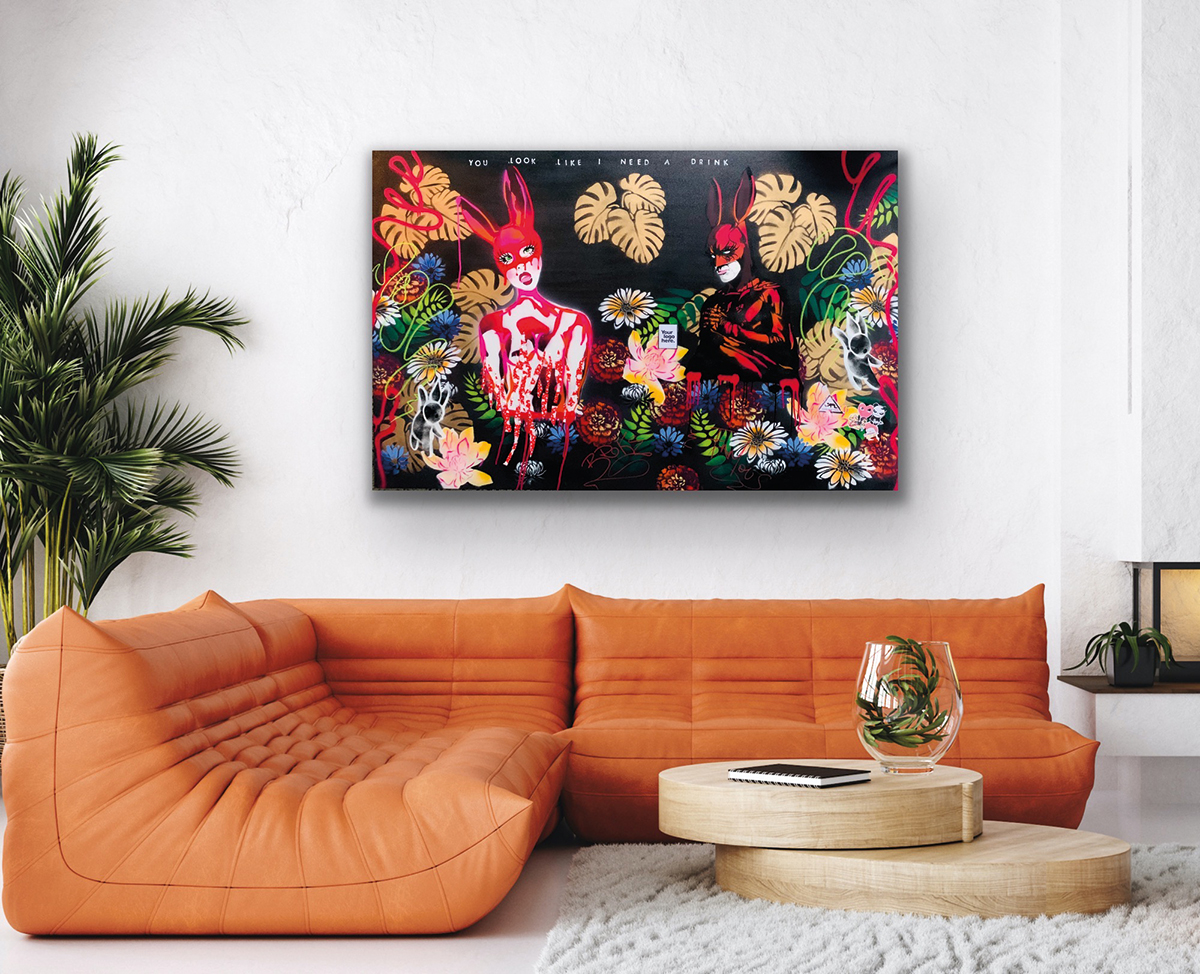 My RR works are multiple layers of coloured resin on canvas. I can only work on one colour every 24 hours or so, building them up until I feel the magic is there. My RUSH graffiti starts with the creation of a freestyle abstract colour creation with the cans, then assigning them a personality and layering up the stencils. Once that process is complete, they move to a separate studio and for some added sass and a layer of clear resin to make it all pop.