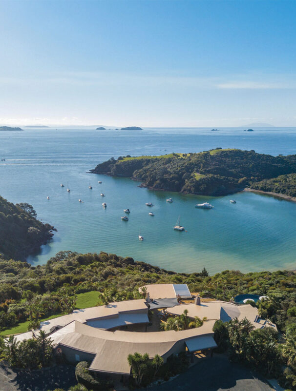Entering the property’s pristine grounds immediately invokes a sense of calm and clarity. Lush green gardens, a vibrant olive grove, and breathtaking views of Owhanake Bay are waiting to greet guests, complemented by the peaceful sound of birdsong.