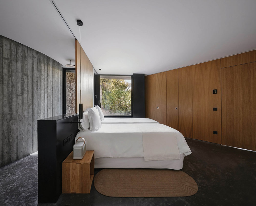 Original arches and beamed ceilings remain intact, forming a tactile dialogue between eras. Barcelona’s Forteza+ Aparicio led the initial design work, while Estudio Carme Pinós later expanded the property with a set of sleek villa suites and a wellness wing that enhances the estate’s architectural rhythm.