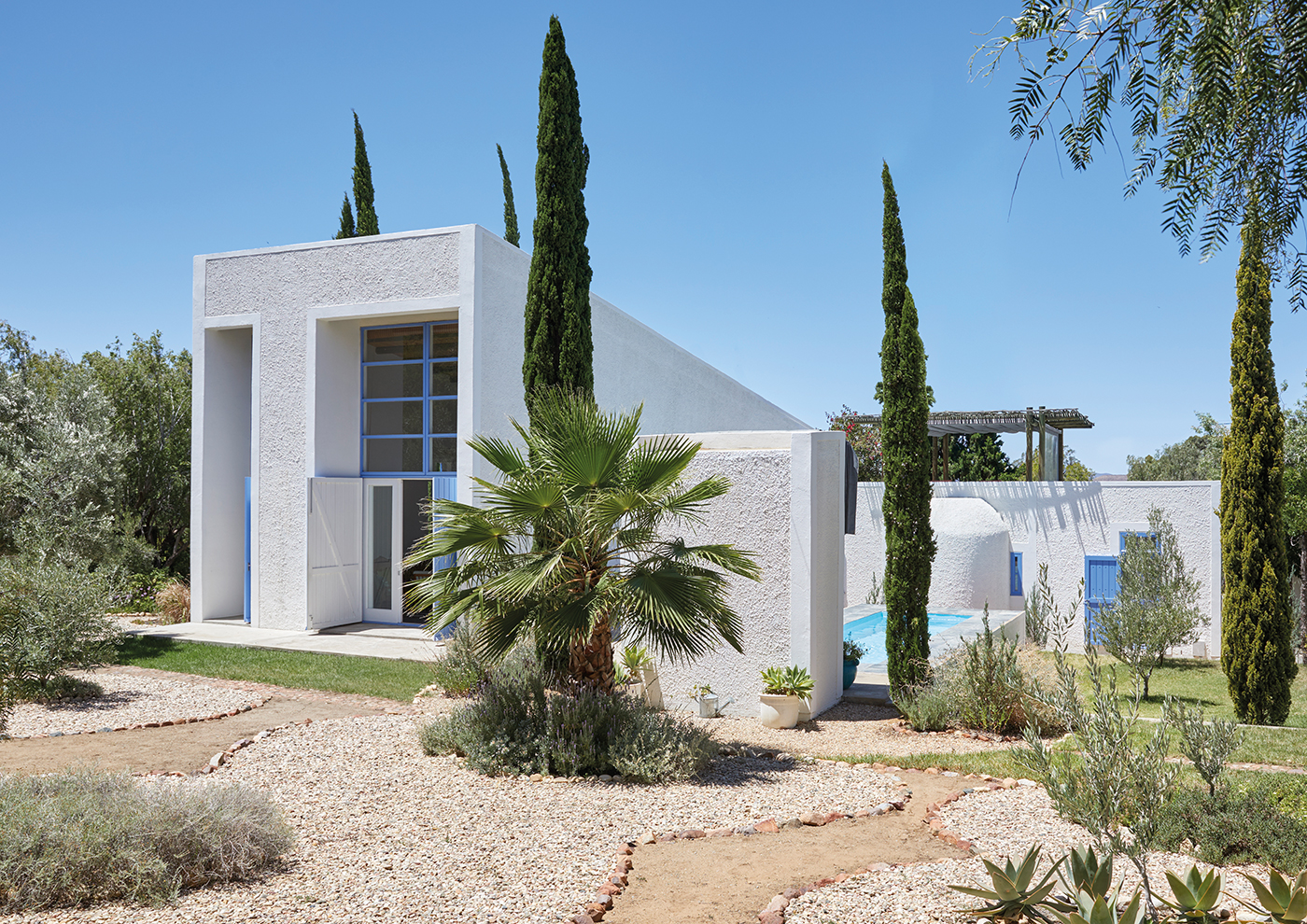A protected central courtyard tucked into the L-shaped arrangement of the main building has a bright blue swimming pool running its length. The blue of the swimming pool reflects the intense blue of the sky, as well as catching the colour of the shutters and doors.