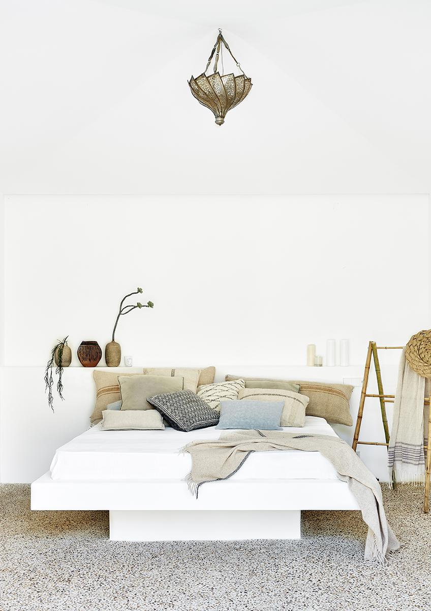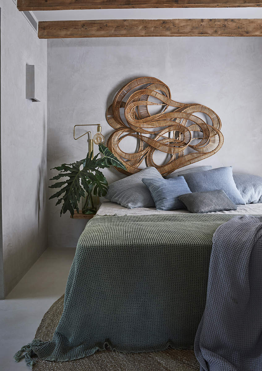 Proof positive that an all-natural bedroom can be highly sophisticated, this space combines a softly finished micro-cement floor with plenty of other natural materials – including wood, bamboo, jute and linen – to create real depth and a subtle sensuality. The bedding and scatter cushions in tones of green, grey and blue add touches of freshness and a genuinely inviting feel.