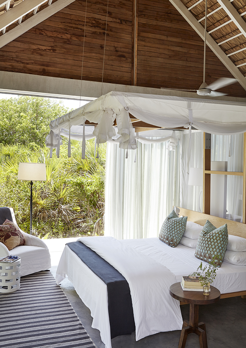 Tip: Airy natural linen and netting – all in white – add much-needed elements of crisp coolness in a tropical setting. Anchor these with chunky, rough-hewn furnishings and finish with decor accents in natural tones to bring the colours of the landscape indoors.