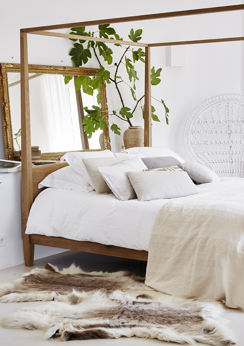 Tip: Use decor elements to add playful and dramatic touches as required. Here, the vintage peacock chair and four-poster add personality to the room, while the sheepskins and ceramic pots on the mantelpiece provide extra tactility.