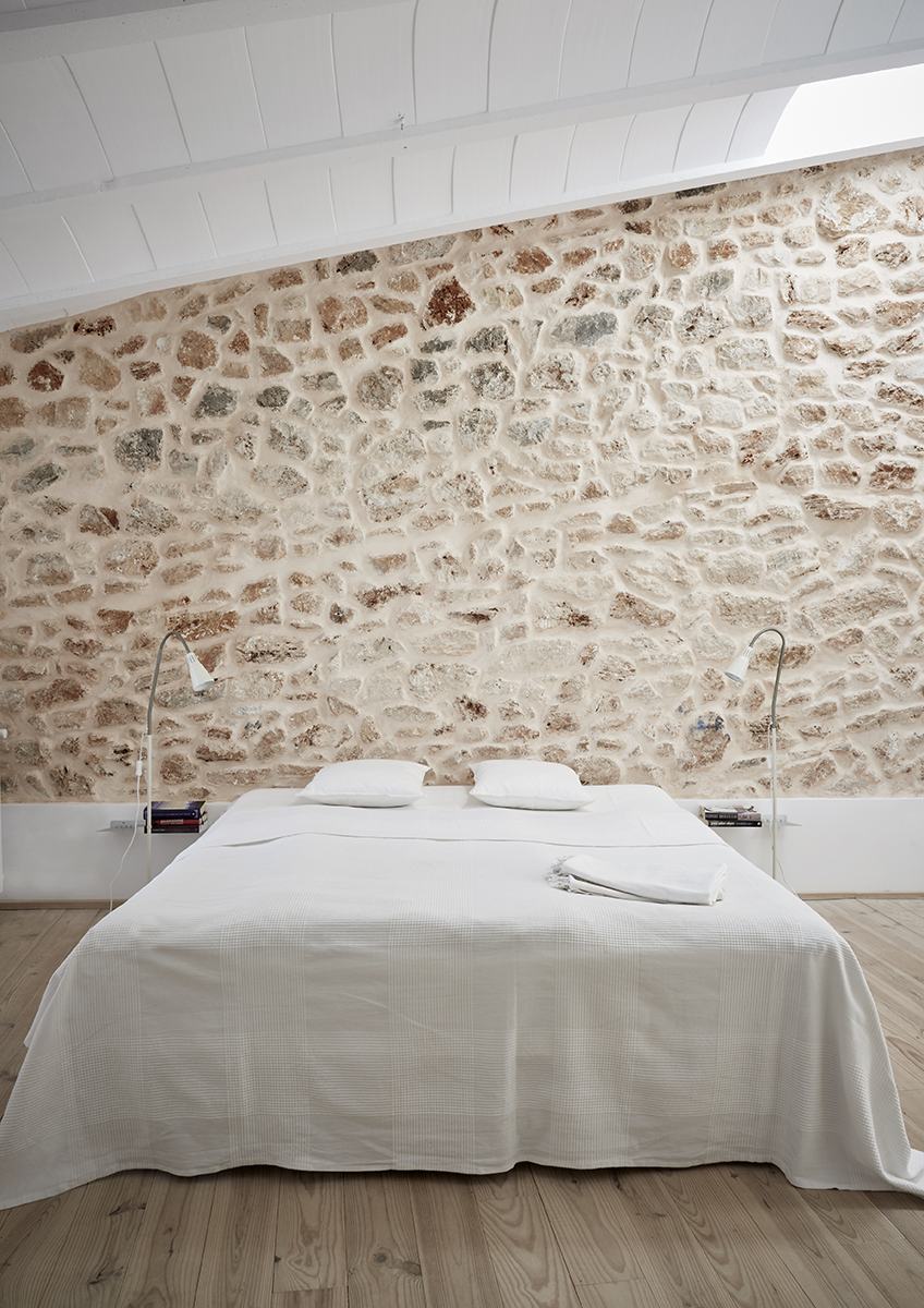 The pared-back main bedroom in this Mediterranean holiday home is all about showcasing the textures of the stone wall uncovered during a recent update. An extra element of originality comes from the two stone hitching posts – originally used for tethering animals and discovered in the courtyard of the property during the renovation – that are set into the wall to hang and display clothing items and accessories.