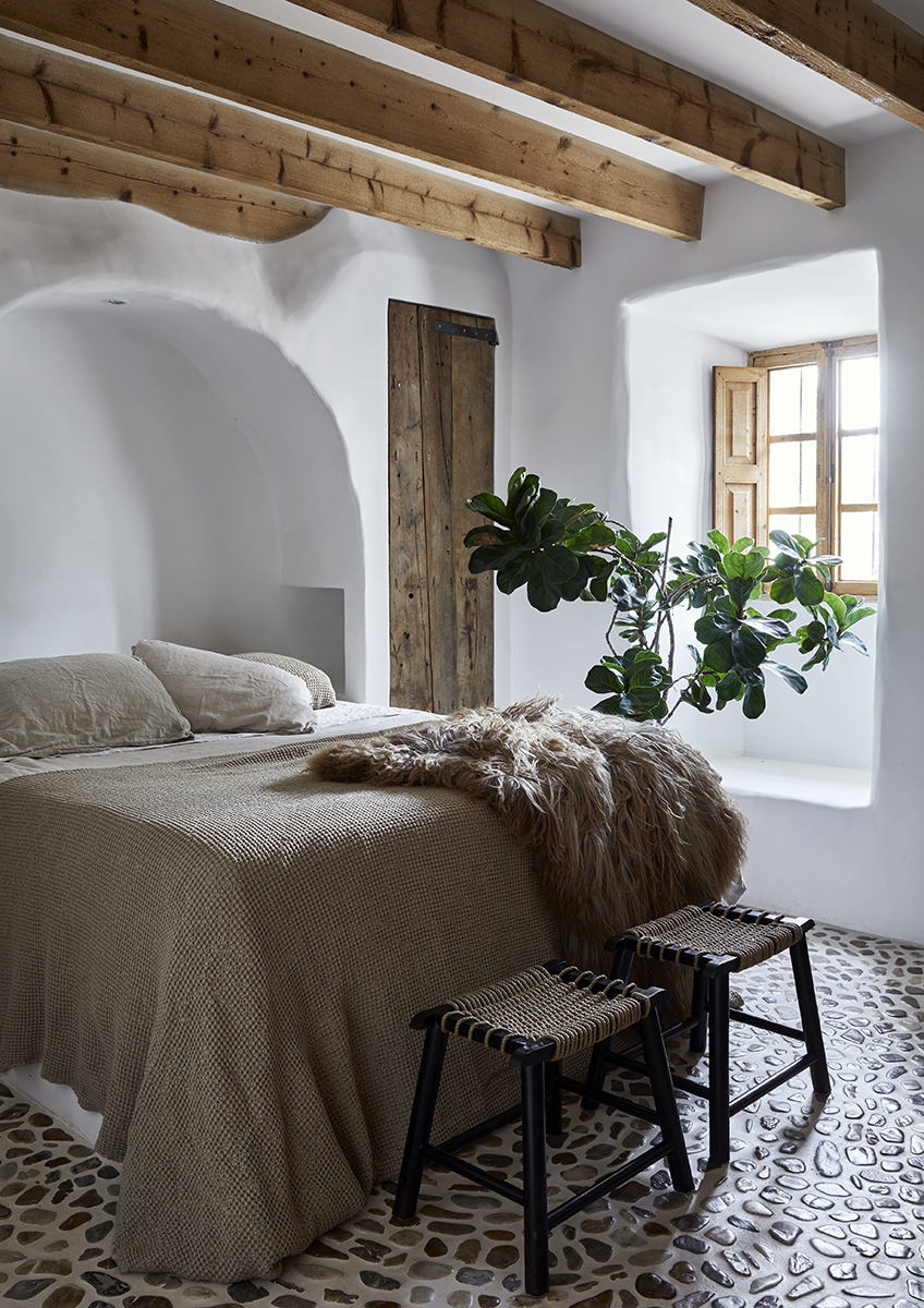 A Swedish filmmaker and photographer’s Mallorca home is the manifestation of his dream of creating a house that was ‘very welcoming and with a warm, cosy feeling,’ he says. The architectural brief was to preserve the dwelling’s original farmhouse features, which has made for rustic yet comfortable spaces. In this bedroom, vintage linen combines with rustic wooden stools to create a traditional yet casual feel.