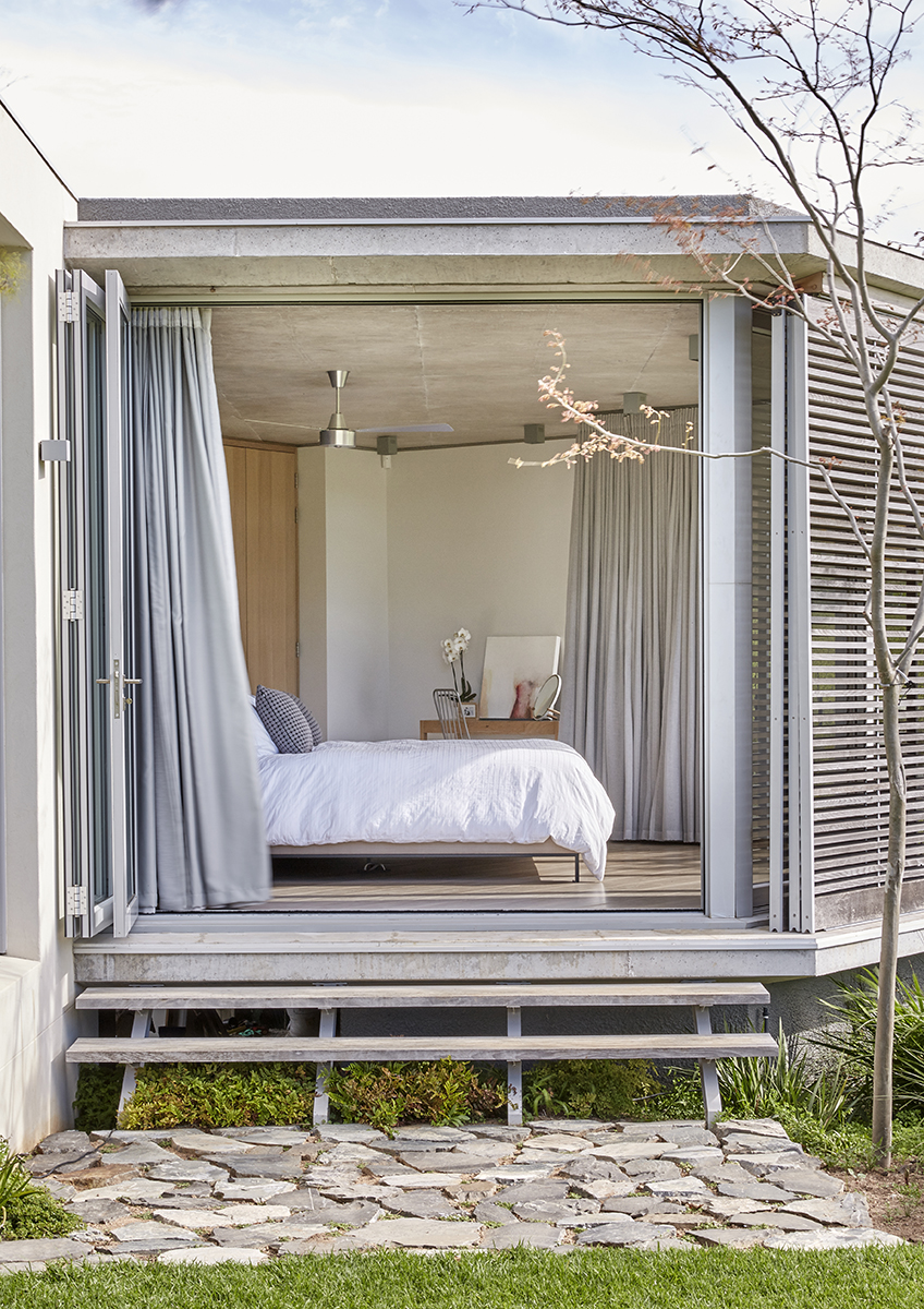 In this, the main bedroom of a home at the foot of Table Mountain in Cape Town, sliding doors open to a balcony with spectacular natural views, while inside, luxuriously large swathes of wooden panelling conceal plenty of storage space and, beyond that, an en suite bathroom. The tactile wood panelling contrasts beautifully with the raw concrete of the staircase that leads up into the space, and is cleverly offset by a minimalist cream linen bedspread.