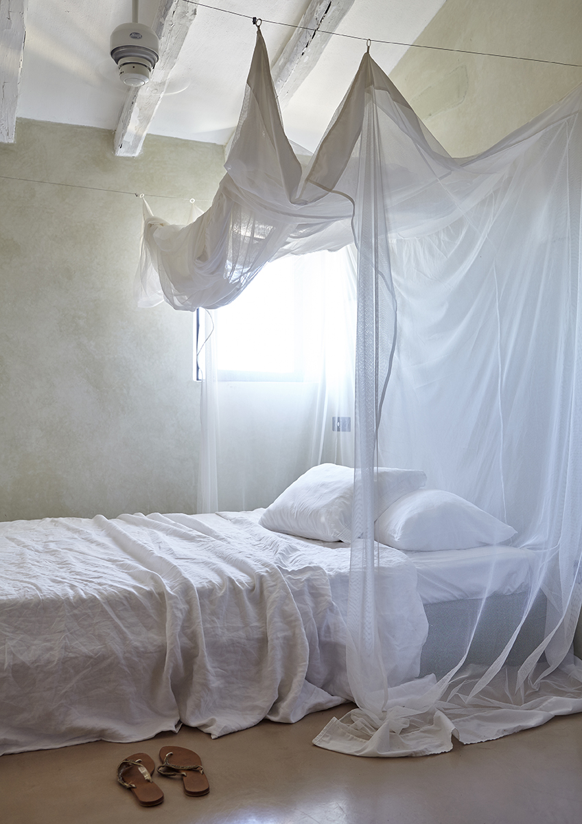 This enviable bedroom is situated in a holiday house near Vilanculos, Mozambique, called Casa Comprida – Portuguese for ‘Long House’. It’s right on the beach, with a traditional fronded jekka roof, and the homeowner asked the architects to create a way to suspend the very necessary nighttime mosquito net from above, rather than having a four-poster bed and so, they designed a delicate yet robust frame that cantilevers off the back of the headboard to support it.