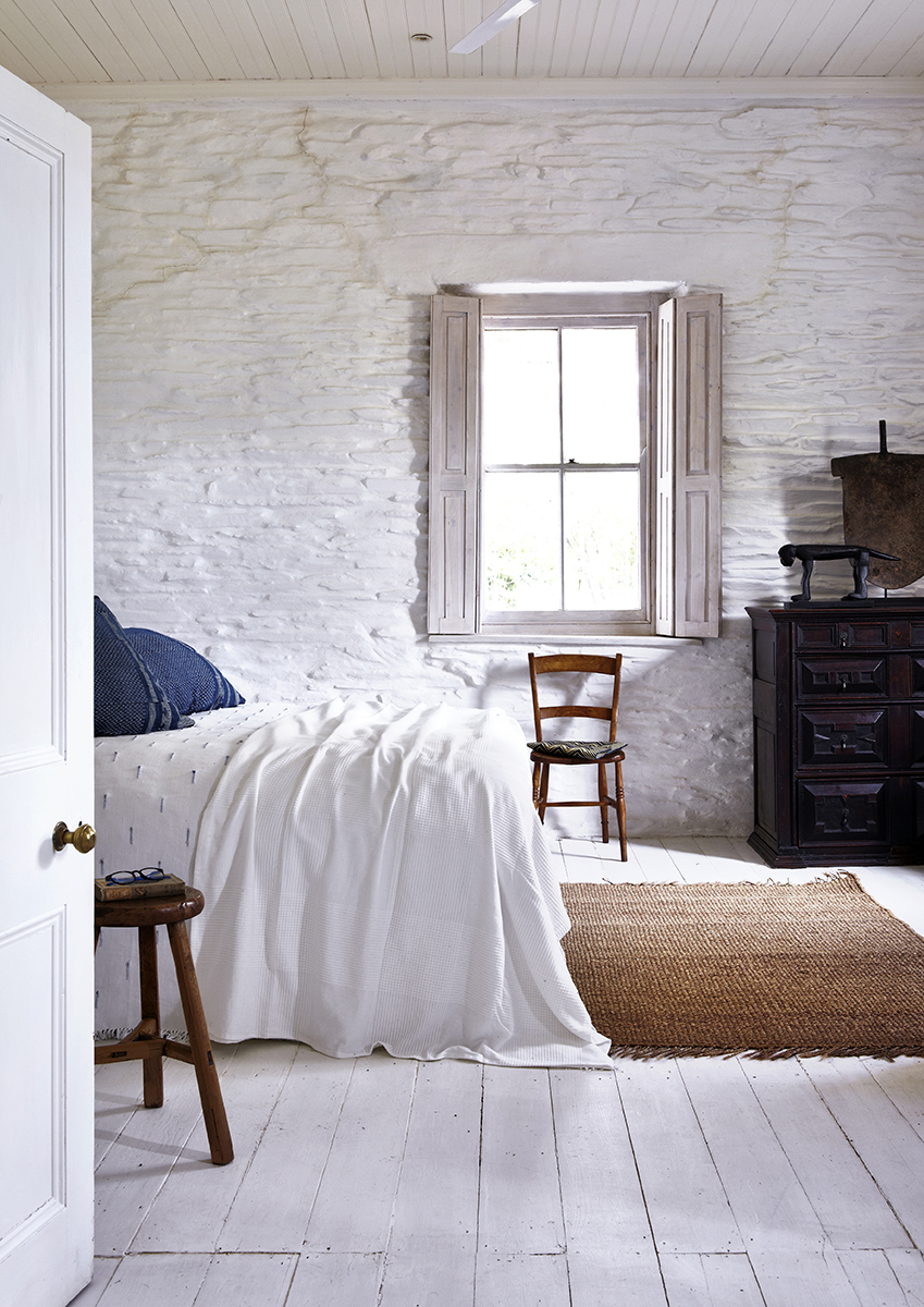 Tip: Layered textures make a simple space inviting, adding warmth without clutter. The natural river-pebble floor in this bedroom combines evocatively with the wooden ceiling beams and windows so typical of farm buildings, with the classic wooden stools and tactile linen throw on the bed adding further authenticity.