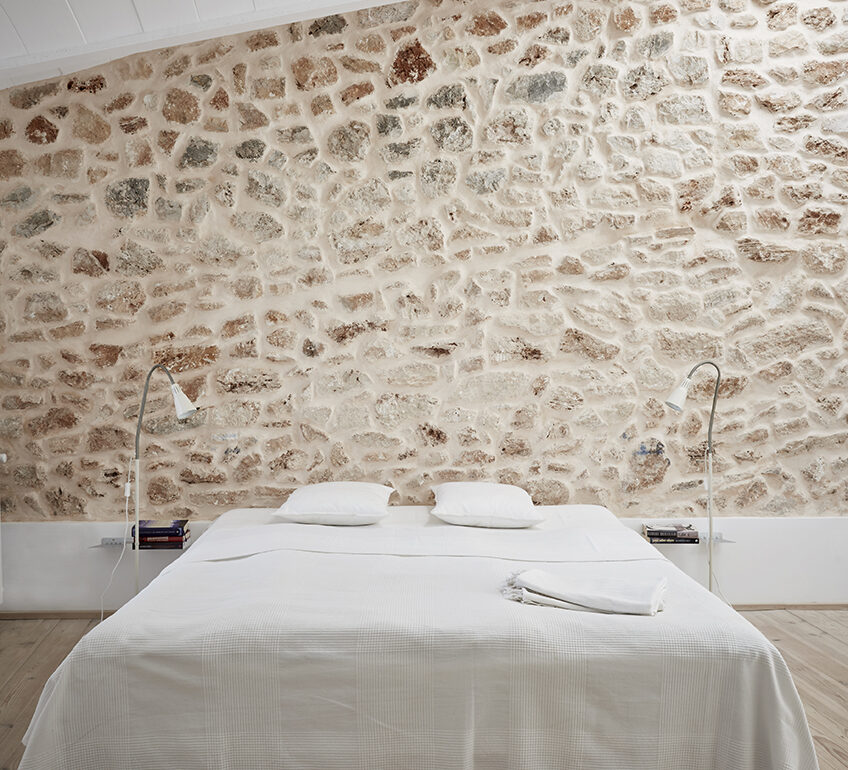 The pared-back main bedroom in this Mediterranean holiday home is all about showcasing the textures of the stone wall uncovered during a recent update. An extra element of originality comes from the two stone hitching posts – originally used for tethering animals and discovered in the courtyard of the property during the renovation – that are set into the wall to hang and display clothing items and accessories.