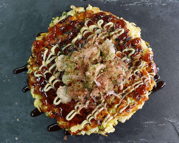 Place the pancake onto the plate and cover with Okonomi sauce. Add some mayonnaise, green seaweed, bonito flake, and your favourite topping on okonomiyaki as you like.