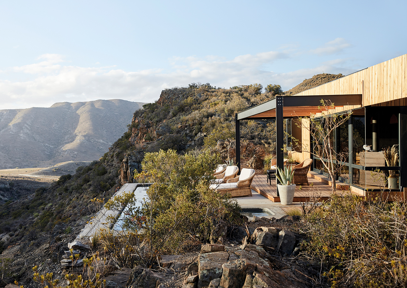 A cliffhanging family cabin near Montagu in South Africa balances bold lines with eco-sensitive choices to connect deeply with the remote landscape it’s embedded in.