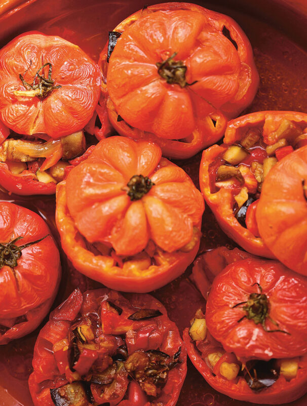 Cut the top off the beef tomatoes and scoop out the insides. Chop these scooped-out bits and add to the pisto. Season well with salt and pepper and simmer gently for 15-20 minutes; the tomatoes will relax and soften, creating the juice.