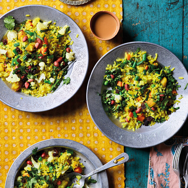 West Bengal is famous for its paddy fields and rice cultivation. Rice is a staple in Kolkata and there are so many different varieties. Basmati rice is most commonly known, but we tend to use different kinds for different dishes. In this recipe we use chirey or chira, which is parboiled rice that has been pounded flat and dried – you may find this sold as ‘rice flakes’ or under any of the following names: chir, chirey, poha, powa or pawa. It’s used in many snack dishes, but this breakfast dish is one of my favourites, as it’s so vibrant to look at and can have a variety of vegetables added to it – a perfect way to use up vegetables in the fridge.