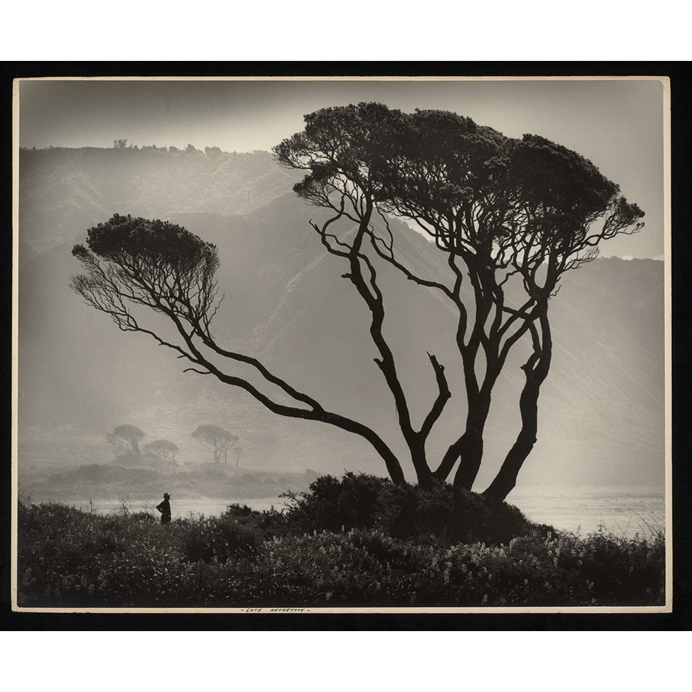 Petersen was a member of several photographic societies and became friends with other members, some of whom would become well known names in New Zealand photography such as Frank Hofmann. But in terms of international photographers I would have to pick Ansel Adams. His style of landscape photography with rich tones and sharp detail and an interest in conservation. Around the mid century, Petersen had only just moved from amateur to professional and the work of contemporaries was likely to have been of interest. Where I find Petersen particularly interesting is his inclusion of a small element like a bird above Lake Manapouri in The Day’s End, or even a small human figure beneath a giant tree in Late Afternoon. This is not merely an aspect of scale, but a sometimes a provocation. Sometimes he celebrates the intersection of humanity and nature, sometimes quite the opposite. Go Home! places a piece of drift wood take at a low angle and resembling a taniwha in confrontation with another a small human figure. Perhaps a similarity with Adam’s conservation interest.