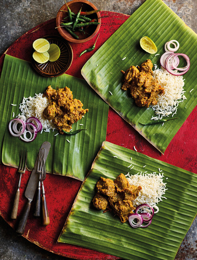 Every trip to Kolkata should include a visit to Golbari in Shyam Bazar, an establishment famous for its kosha mangsho. The lamb pieces are cooked with spices over a long period of time, making the gravy thick and intensely rich and delicious. Everyone who makes kosha mangsho aspires to achieve this flavour, as it’s difficult to forget once you’ve tried it. The dish is a firm favourite served up at most weddings and family gatherings. Traditionally, the wedding meal is served on a banana leaf. Rows and rows of banana leaves will be laid out on long tables and servers come round with silver dishes to serve the guests. Several sittings will take place in the evening to accommodate everyone. There will be a pinch of salt (as Benaglis love to add salt to their meal when eating), chillies and lemon or lime. It’s a clever novelty: cheap, because of the vast numbers of banana trees in India; eco-friendly; and easy to dispose of with very little to wash up (a boon as we have such large numbers at weddings).