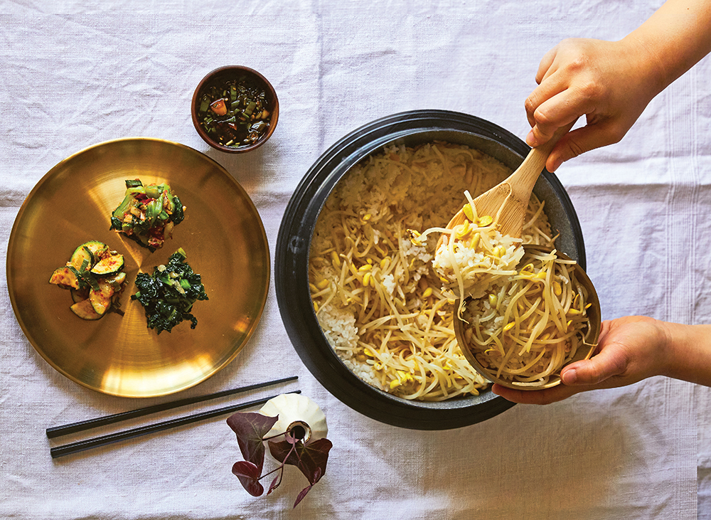 Rinse the soybean sprouts under cold water. If desired, trim about 1 cm from the ends of the sprouts for a more appealing presentation, and add them to the pressure cooker with the rice. Add 500ml (2 cups) water, cover with the lid and bring to the boil.